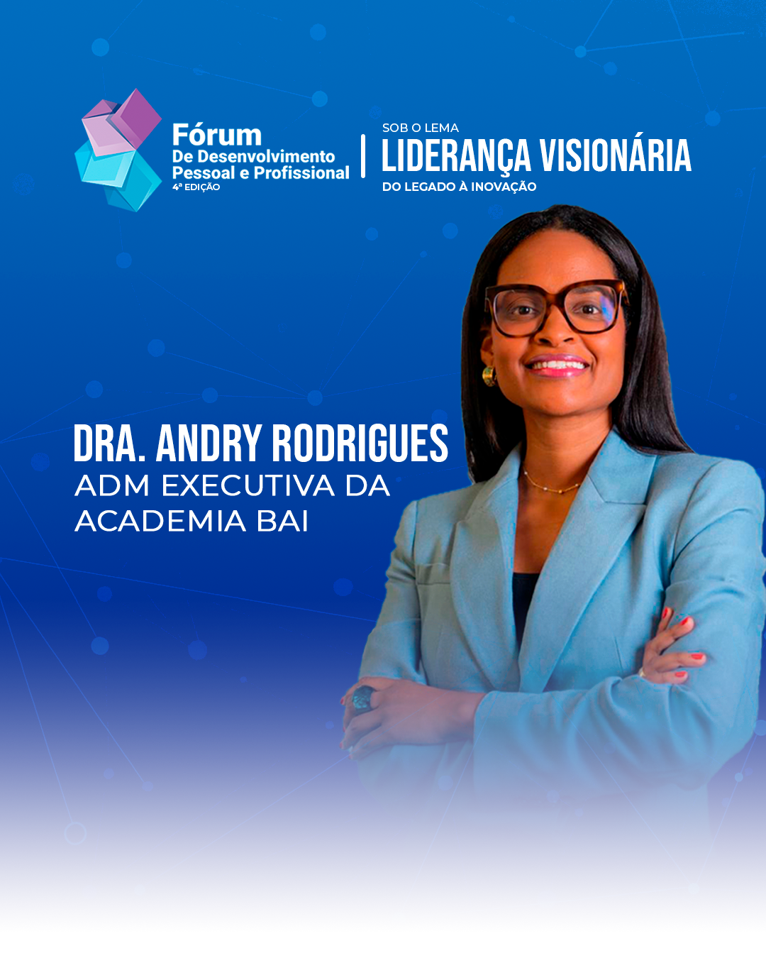 Andry de Sousa Rodrigues, Administradora Executiva da Academia BAI, está confirmada como moderadora na 4.ª Edição do Fórum de Desenvolvimento Pessoal e Profissional, evento que celebra os 50 anos da Independência de Angola sob o tema “Liderança Visionária: Do Legado à Inovação.”